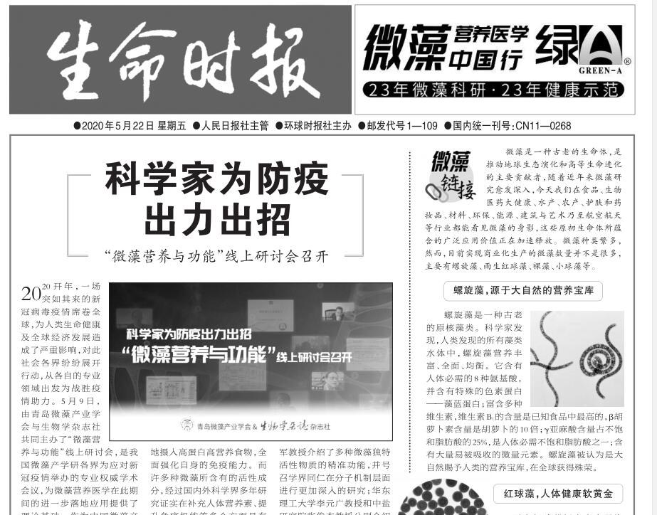 當(dāng)前位置:首頁 > 資訊中心 > 綠A·聚光燈 > 《生命時報(bào)專刊》科學(xué)家為防疫出力出招,“微藻功能與營養(yǎng)”